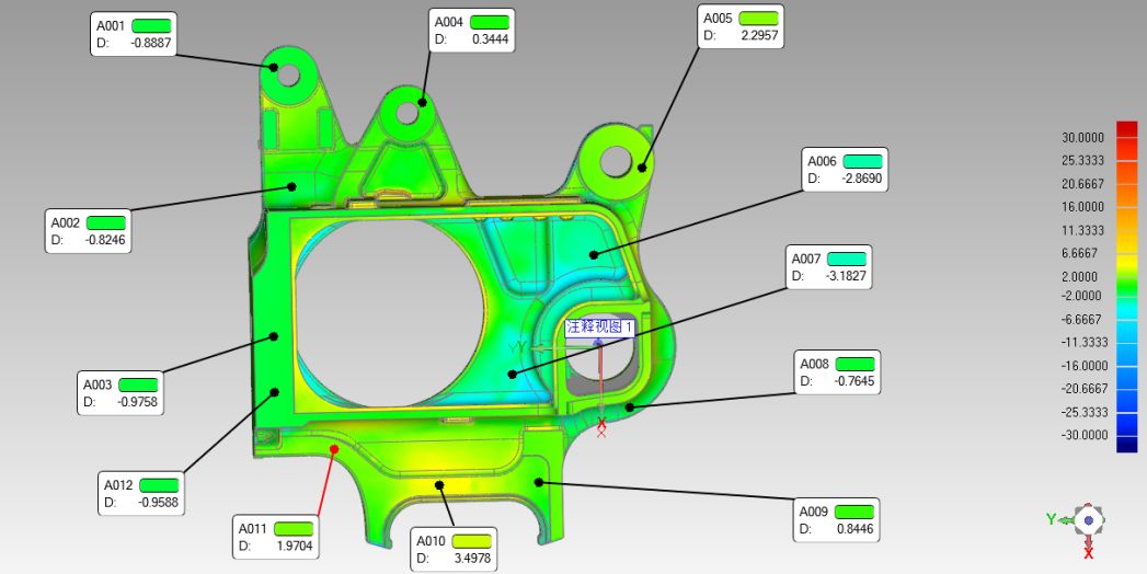 將軟件輸出的工件成品的三維模型和三維設計數模進行對齊后,進行偏差對比分析,判斷其偏差是否在容差范圍內,輸出工業檢測報告。