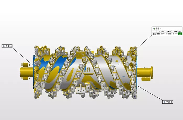 銑刨鼓是道路銑刨機的核心,需經過嚴格的檢測,以避免磨損以及變形的負荷縮短設備使用壽命。過去采用接觸式打點來進行檢測,不但測量速度慢,而且測量死角多,測量數據不全,且銑刨鼓的刀頭為活動刀頭,裝配后測量無法測得準確的刀頭點位。